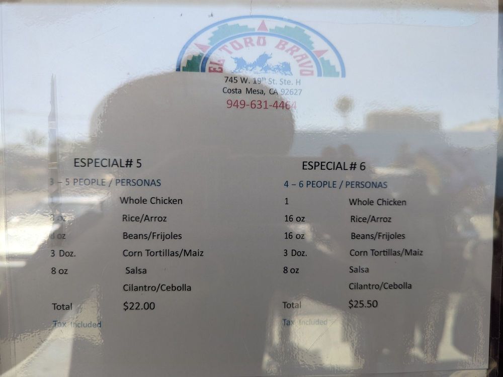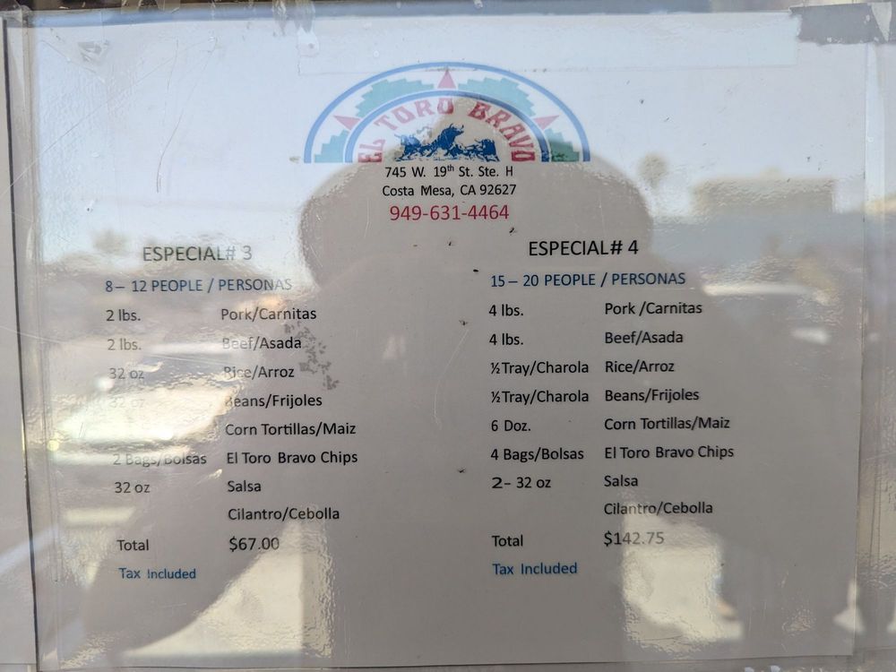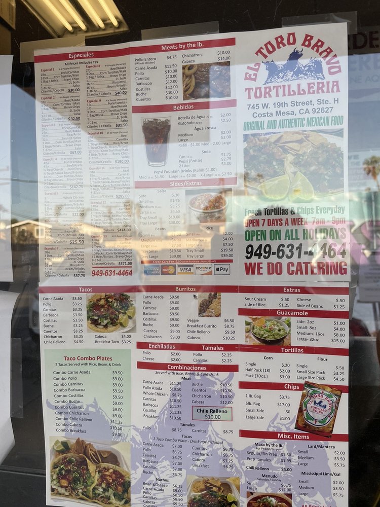Introducing the menu at El Toro Bravo Tortilleria, a hidden gem in Westside Costa Mesa, known for their generous portions and flavorful Mexican cuisine. The Barbacoa tacos, loaded with tender and moist meat, stand out, complemented by a spicy sauce and fresh onions/cilantro. The star of the show, their tortillas, offer a unique texture and flavor that sets this place apart. Specials like the #9, featuring two pounds of meat, tortillas, salsa, soda, and chips for just $32, provide great value and easily feed a group. The Carne Asada Burrito and stacked enchiladas are must-tries, showcasing the authentic flavors of Tex Mex cuisine. The service is quick, the staff friendly, and the rustic atmosphere adds to the charm of this spot. Whether you're a long-time fan or a first-time visitor, El Toro Bravo Tortilleria promises a memorable dining experience.