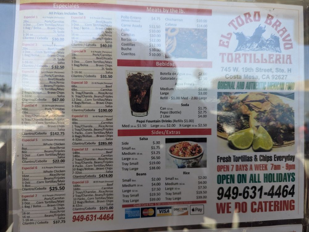 El Toro Bravo Tortilleria Menu (Update 2025)
